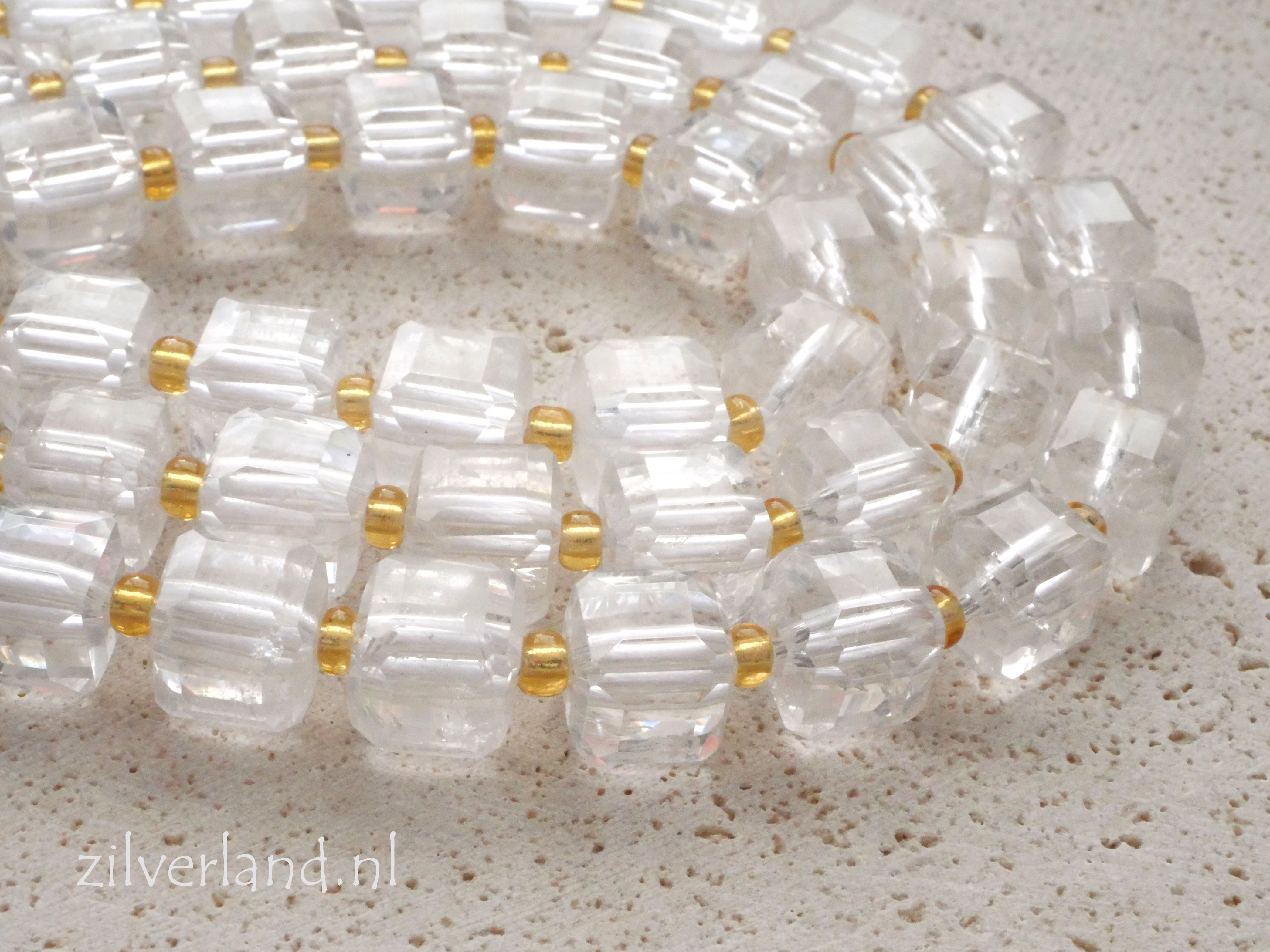 Bergkristal edelsteen kralen van 10mm, kubus. Lengte van de streng is 39cm.