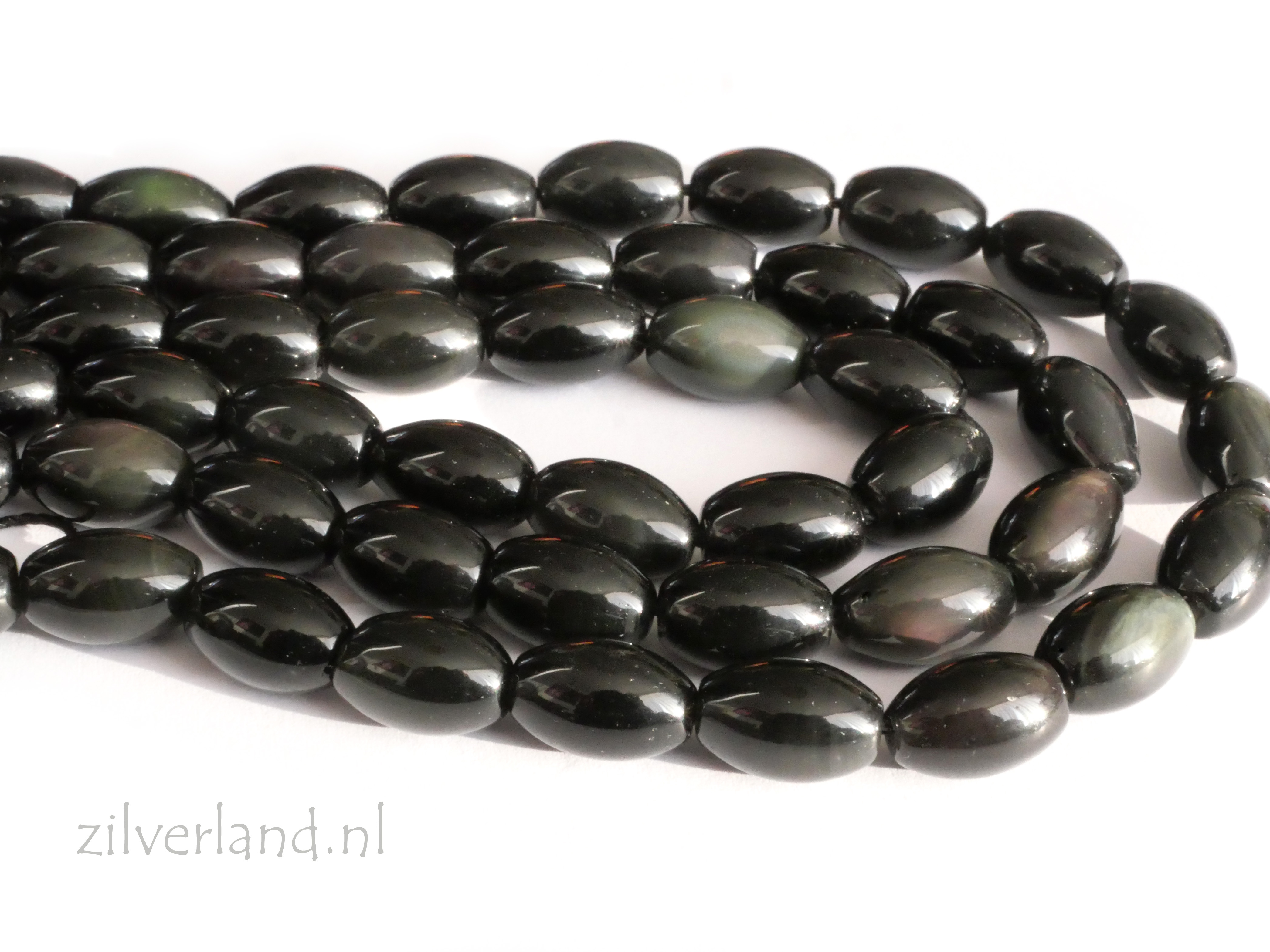 Regenboog Obsidiaan is een bijzondere edelsteen die bekendstaat om zijn donkere basis met zachte, iriserende kleurreflecties die zichtbaar worden in het licht. Deze Regenboog Obsidiaan edelsteen kralen van 10 mm x 7 mm hebben een verfijnde en mysterieuze uitstraling, ideaal voor unieke sieradenontwerpen.
