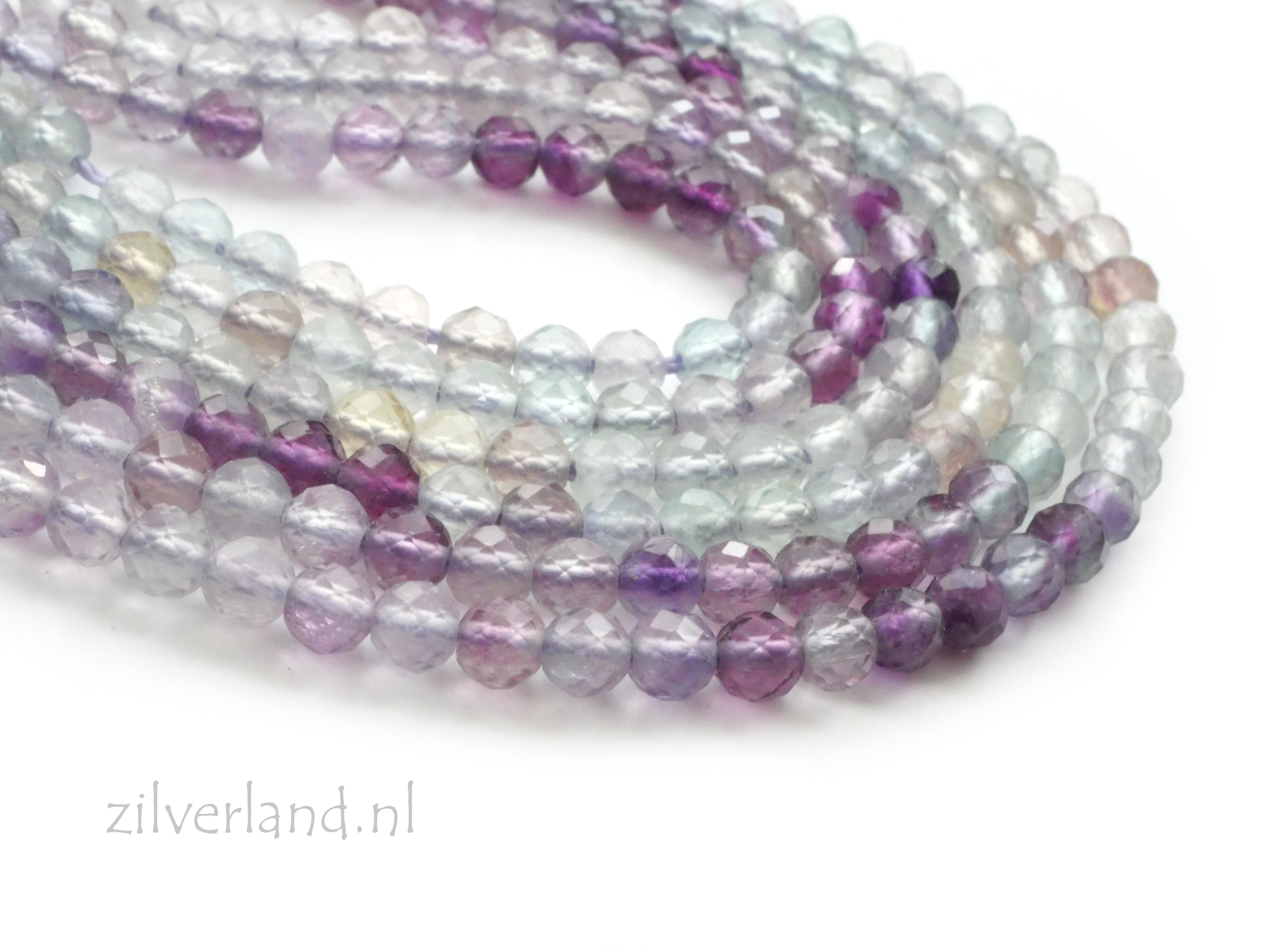 Facet geslepen Fluoriet edelsteen kralen van 3mm. Lengte van de streng is 39cm.